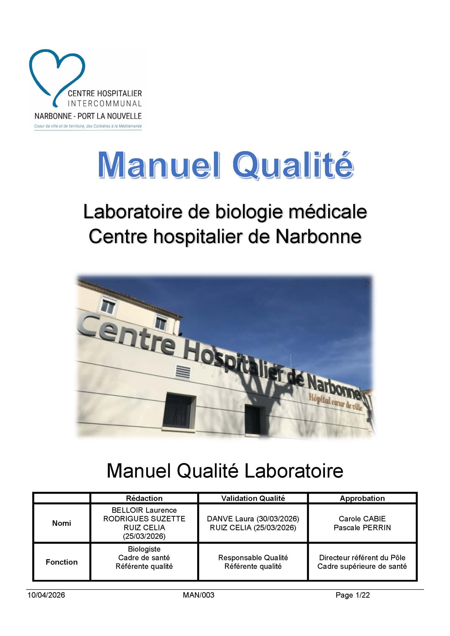 Equipé de matériels de dernière génération offrant toutes les garanties de fiabilité et de rapidité, le laboratoire de biologie médicale de l’hôpital de Narbonne est en capacité de réaliser une grande diversité d’analyses dans les différents domaines de la biologie médicale.  Pour plus d’informations sur les analyses effectuées vous pouvez vous référer à notre Manuel de Prélèvement accessible en ligne depuis cette page.